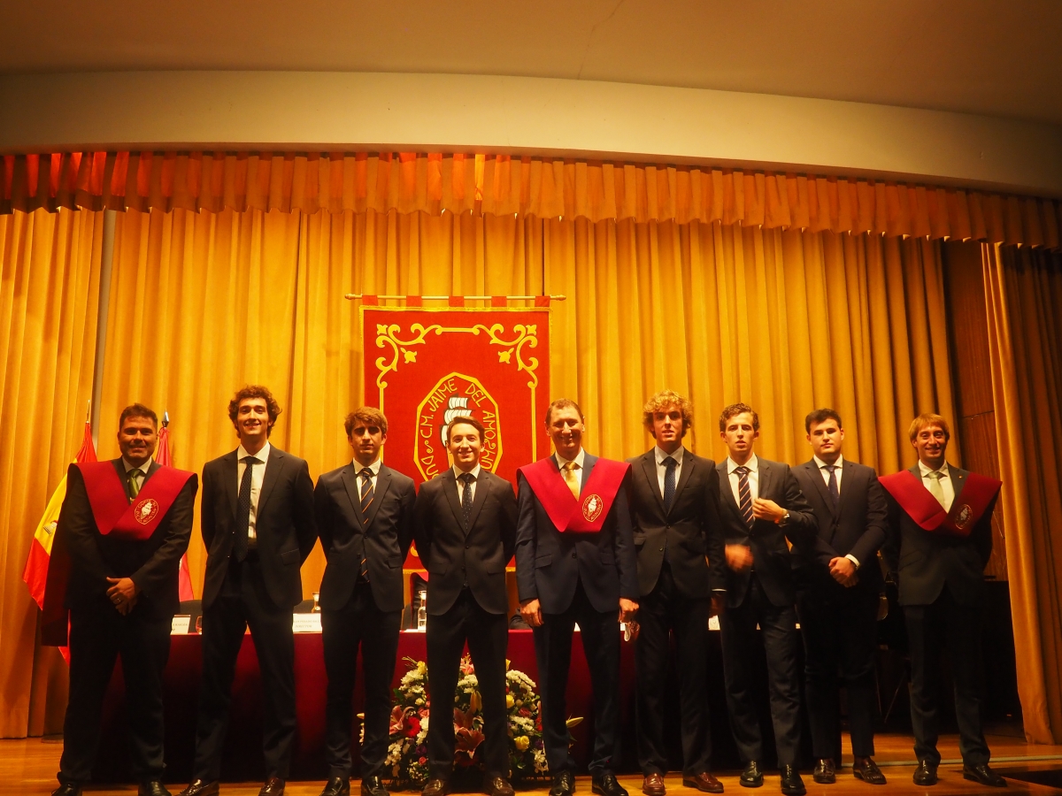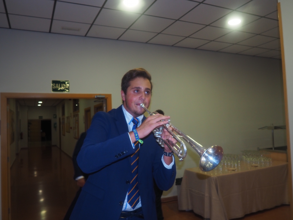 Para finalizar la velada, el Colegio invitó a los colegiales, como siempre, a un Cóctel de Bienvenida. En esta ocasión, debemos lamentar que, a pesar de tener todo organizado para recibir también a una invitada por colegial, las tormentas no nos permitieron cumplir con esta tradición, ya que en los salones hubiéramos superado el aforo permitido. La nota de color en el cóctel fue la sorpresa que nos dio el colegial de primer año, D. Francisco Javier Carreño Serra, que amenizó con sus canciones de charanga un rato de la cena.