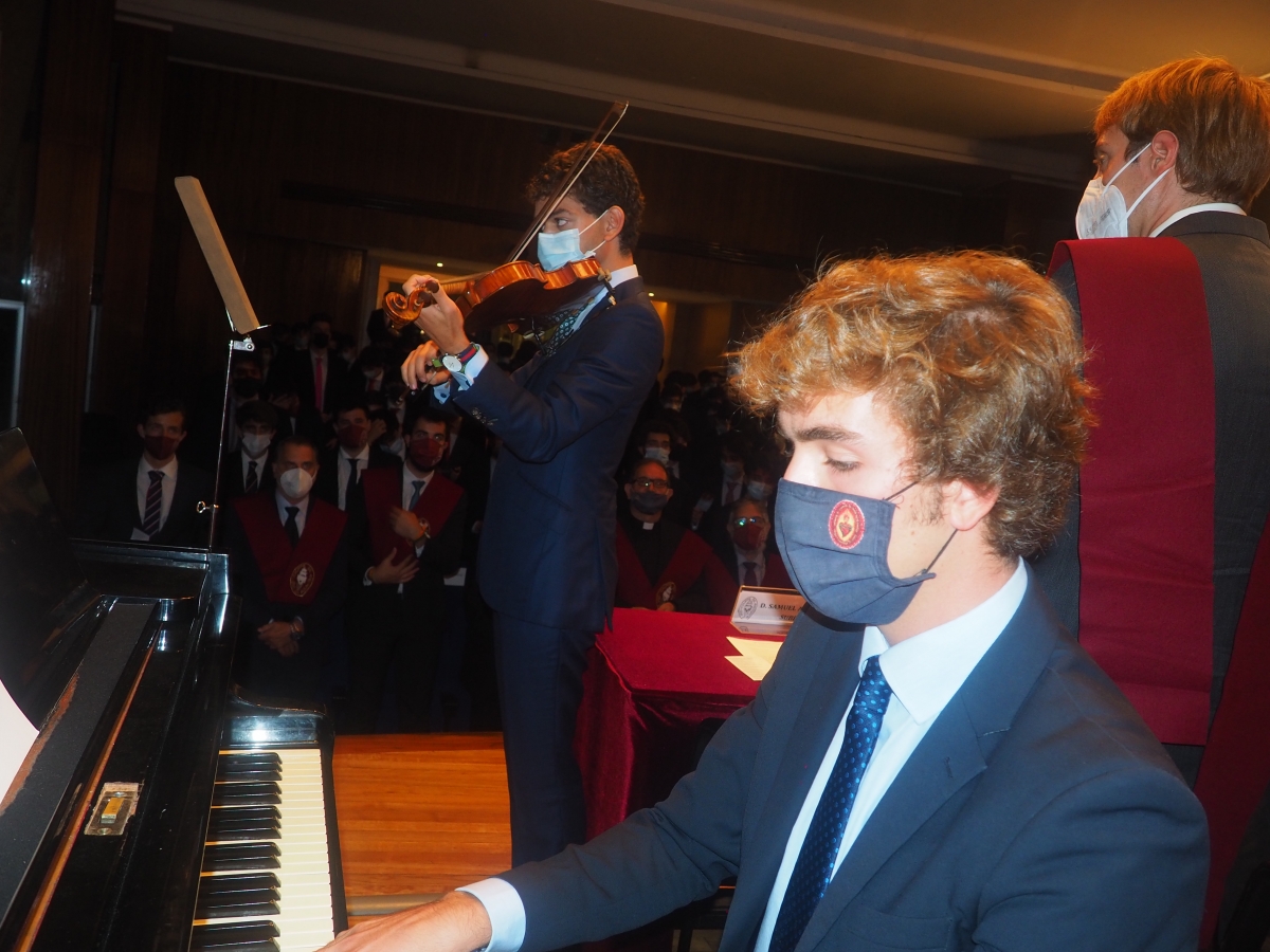 Cerró el Acto Académico el presidente, P. Adolfo Lamata, CMF., que, tras sus palabras de aliento a la comunidad colegial, y antes de declarar oficialmente inaugurado el Curso Académico 2021/2022, presentó el tradicional Gaudeamus Igitur, que interpretaron magistralmente dos colegiales de tercer año, al piano Víctor García Troyano, y al violín Guillermo Alonso-Jáudenes Paz.