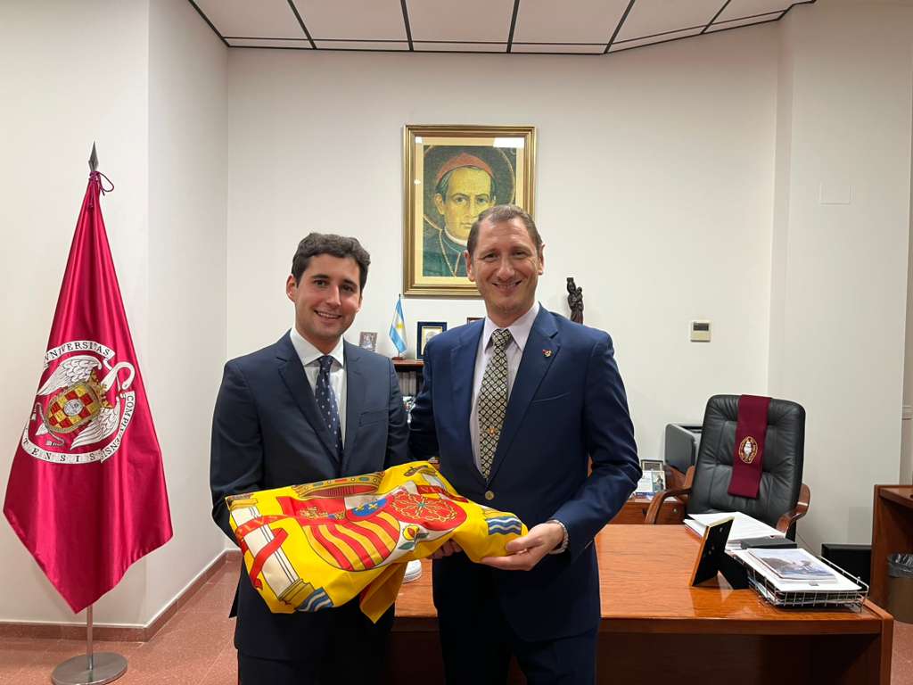 Como es costumbre, con motivo de esta celebración, el director del Colegio Mayor concede el honor a un antiguo colegial de donar la bandera que ondeará durante todo el curso en la torre principal del edificio. Este año, ese reconocimiento recayó en Marcos Santos, antiguo colegial becado y decano del Jaime del Amo, natural de Logroño y antiguo estudiante de Magisterio de Primaria y Pedagogía. Su dedicación, compromiso y cariño hacia el Mayor fueron recordados con emoción, y la nueva bandera fue entregada solemnemente el 12 de octubre, en la antesala de los actos conmemorativos.
