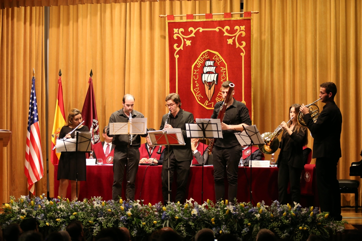Tras este primer bloque de intervenciones, tuvimos otra gran aportación a nuestro día. Sentíamos como un deber hacer espacio en nuestro Acto a la buena música. La “Del Amo Fundation” donó en el año 1967 el piano que seguimos teniendo en nuestro Auditorio, para que, textualmente “donde las palabras fallasen, hablase la música”. No han faltado a lo largo de estos 50 años buenos intérpretes y estudiosos de la música en el Colegio, de piano, violín, trompa, cello. Por esto, quisimos tener a la orquesta JOECOM, Joven Orquesta de Colegios Mayores, que sin dudarlo un momento aceptaron nuestra invitación, y a la que agradecemos la profesionalidad con la que elevaron el nivel cultural de nuestro Acto.