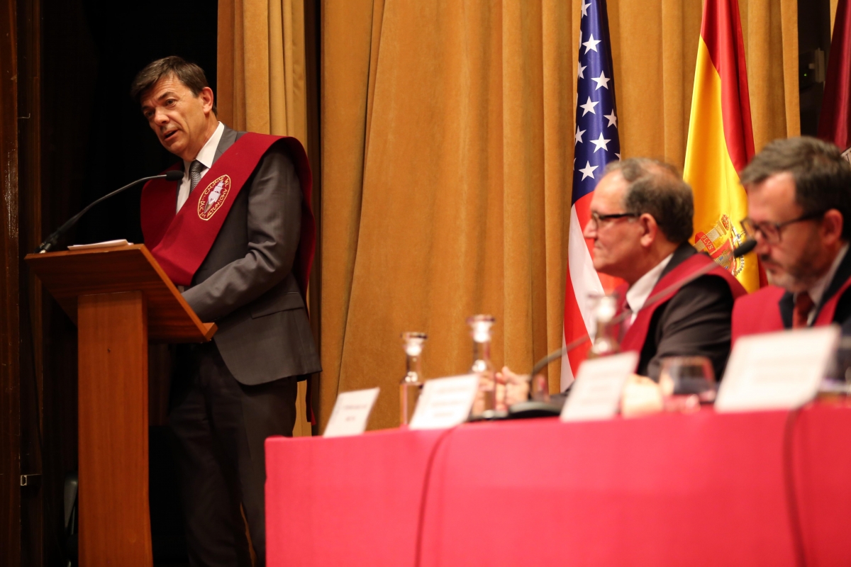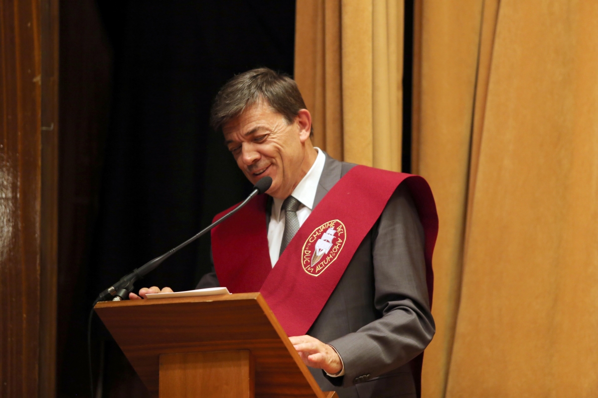 El último de los miembros de la Mesa Presidencial en intervenir, como procede protocolariamente, fue el propio Presidente del Acto, D. Carlos Andradas Heranz, Rector Magnífico de la Universidad Complutense de Madrid. En su amena locución, nos sorprendió contando su propia experiencia como becado por la “Del Amo Fundation” para realizar intercambio con una Universidad americana. De nuevo muchas gracias por acompañarnos en este día tan especial para nuestro Mayor, algo que valoramos mucho, siendo conscientes de la agenda tan apretada que por su cargo tiene en estas fechas.