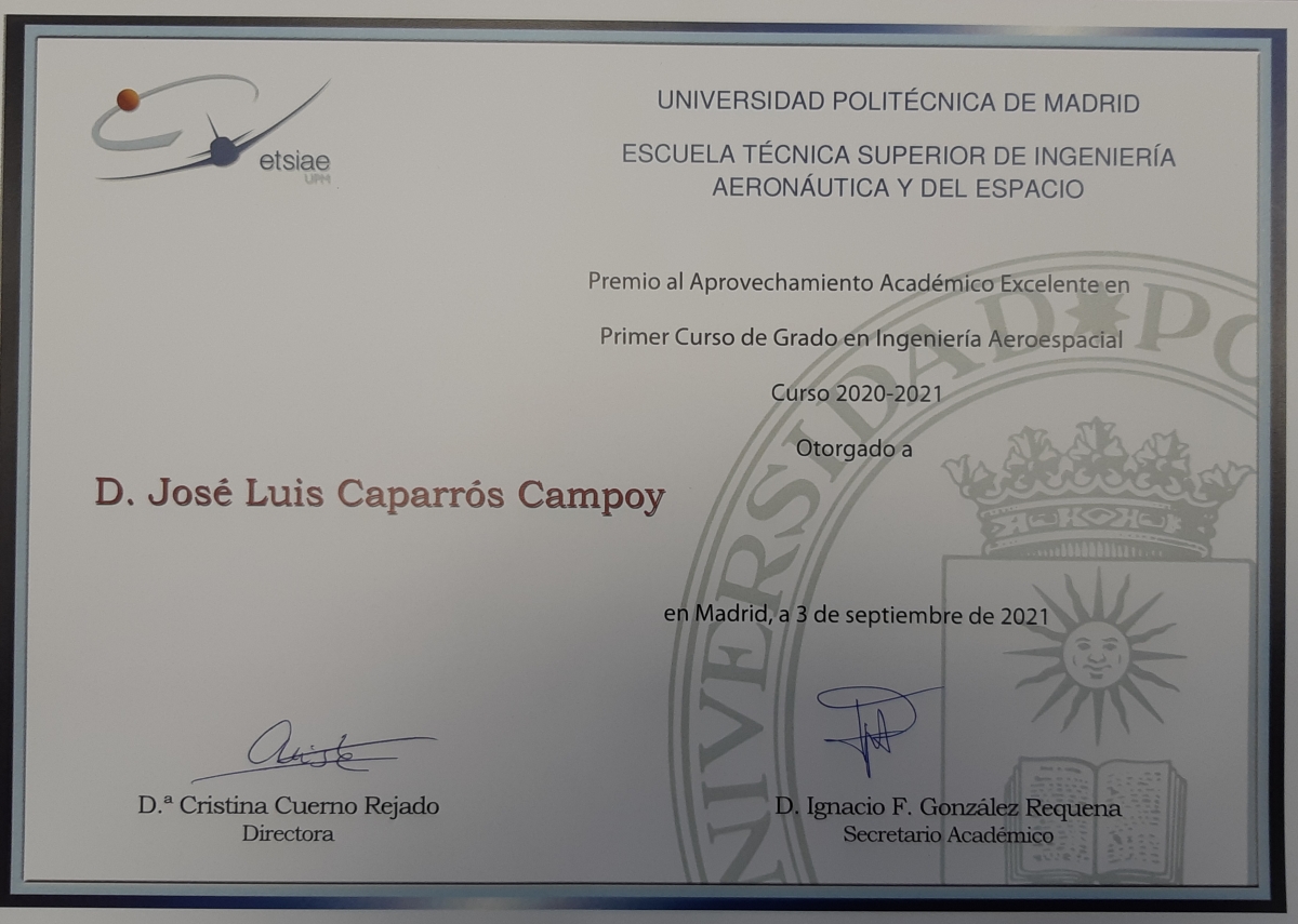 Siempre resulta importante para nuestra Institución dar difusión de la actividad, iniciativa y logros de nuestros actuales y antiguos colegiales. En este caso es el turno de hablar de D. José Luis Caparrós Campoy, colegial de 2do año del Jaime del Amo. El pasado viernes 3 de septiembre José Luis, quien cursa 2do año en Ingeniería Aeronáutica y del Espacio en la Universidad Politécnica de Madrid (Oficial), recibió el Premio al Aprovechamiento Académico Excelente por ser el mejor promedio de calificaciones de su promoción durante el curso 2020-2021.