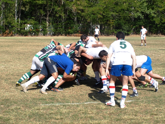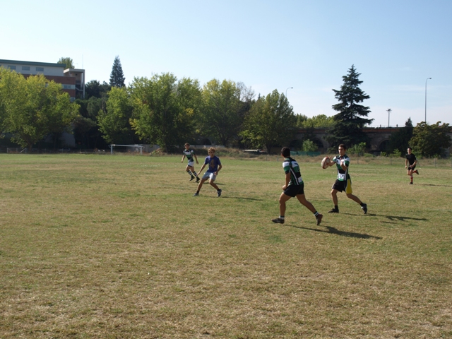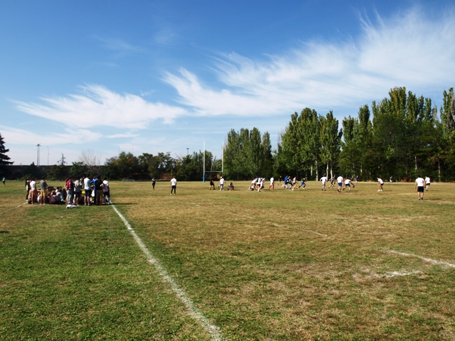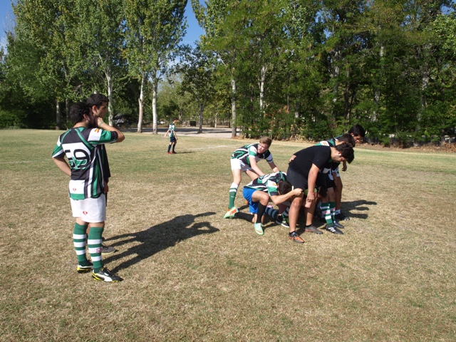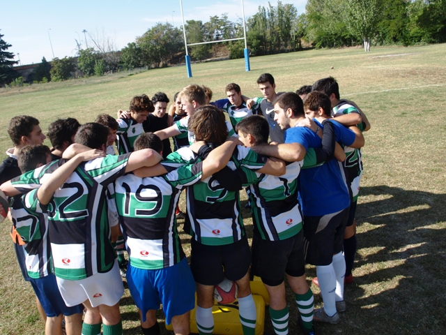 Nuestro equipo, con solo 4 jugadores titulares con experiencia, asume este año el gran reto de reconstruirse. La previa al partido sirvió para que algunos tuvieran por primera vez contacto con el balón ovalado, o aprendieran a hacer eso que solo han visto en la tele: la melé.