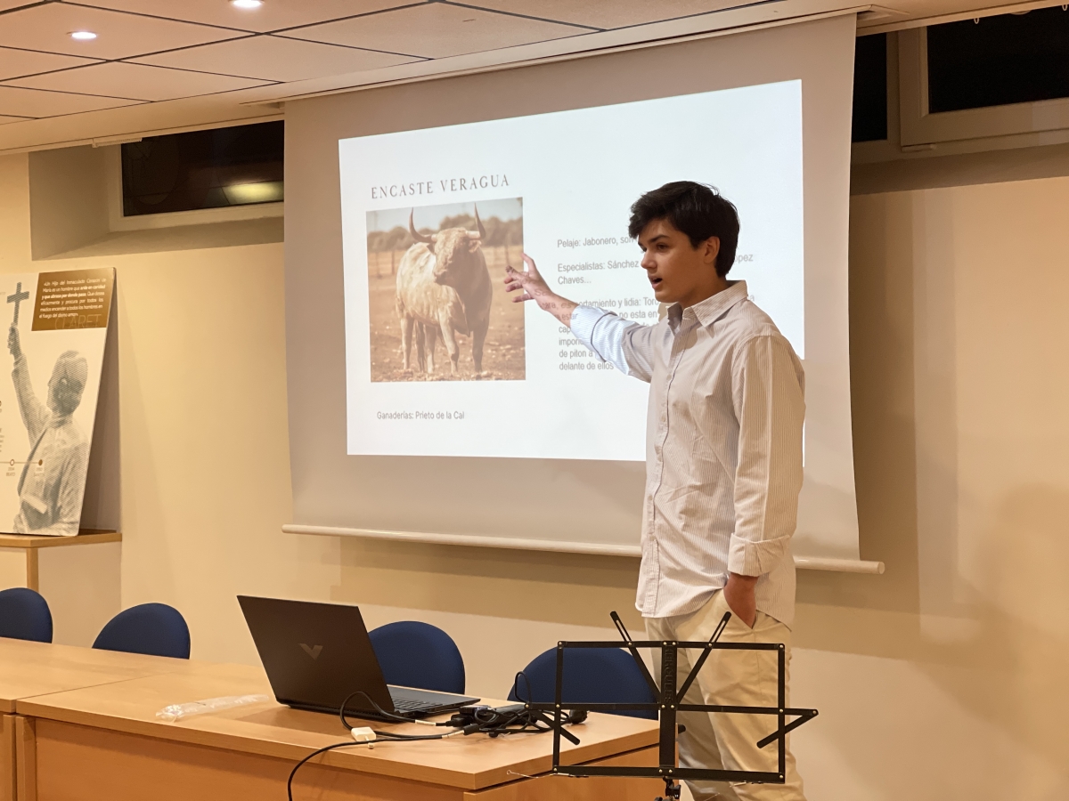 Comenzó el colegial D. Pelayo Álvarez Fernández, en una disertación sobre el toro bravo, y sus diferentes encastes. Los colegiales pudieron aprender a identificar características que desconocían en el toro.