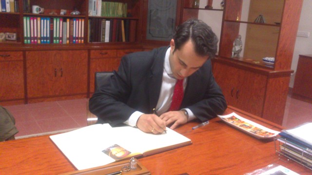 Tras su conferencia, el Dr. Gallego accedió a firmar el Libro de Honor del Mayor, exhibiendo en su dedicatoria, al igual que en su ponencia, un estilo relacional muy afable y humilde.