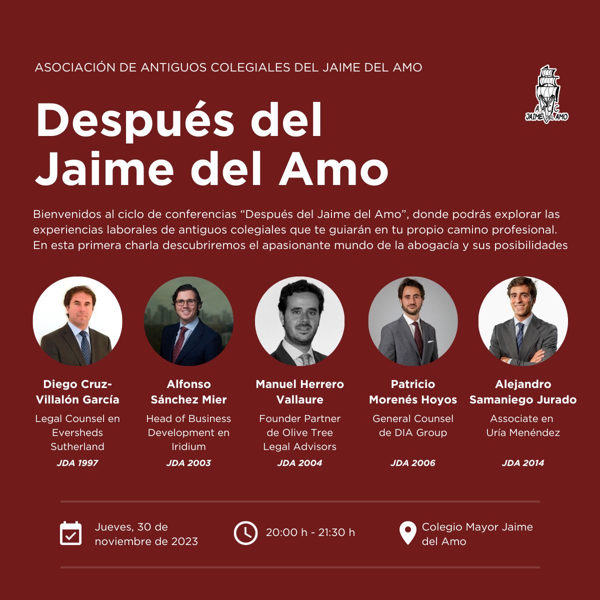 Con una Junta Directiva renovada tras el parón que supuso la pandemia, ha planificado para este curso un ciclo de conferencias que ha bautizado con el título “Después del Jaime del Amo”. Con este ciclo pretende poner al servicio de los colegiales, y antiguos colegiales, las experiencias laborales de antiguos jaimitos, en distintas áreas de estudios, con el fin de inspirar caminos profesionales diversos.