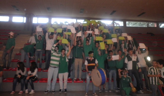 Durante todo el partido, nuestra afición tiñó de verde y blanco la grada. Al final del partido, dimos un ejemplo de señorío, aceptando, inmediatamente, la derrota, reconociendo los méritos del equipo rival y su afición, mediante un aplauso general desde el propio parquet.