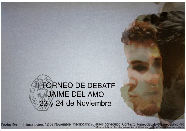 El Colegio Mayor Jaime del Amo convoca para los días 23 y 24 de noviembre el II Torneo de Debate «Jaime del Amo», un torneo de debate abierto a todos los equipos que deseen participar de Colegios Mayores o de Universidades de toda España. La inscripción está abierta hasta el 12 de noviembre (cuota de inscripción por equipo: 70 euros). Habrá un máximo de 16 equipos participantes (eso significa que inscribirse cuanto antes es importante).