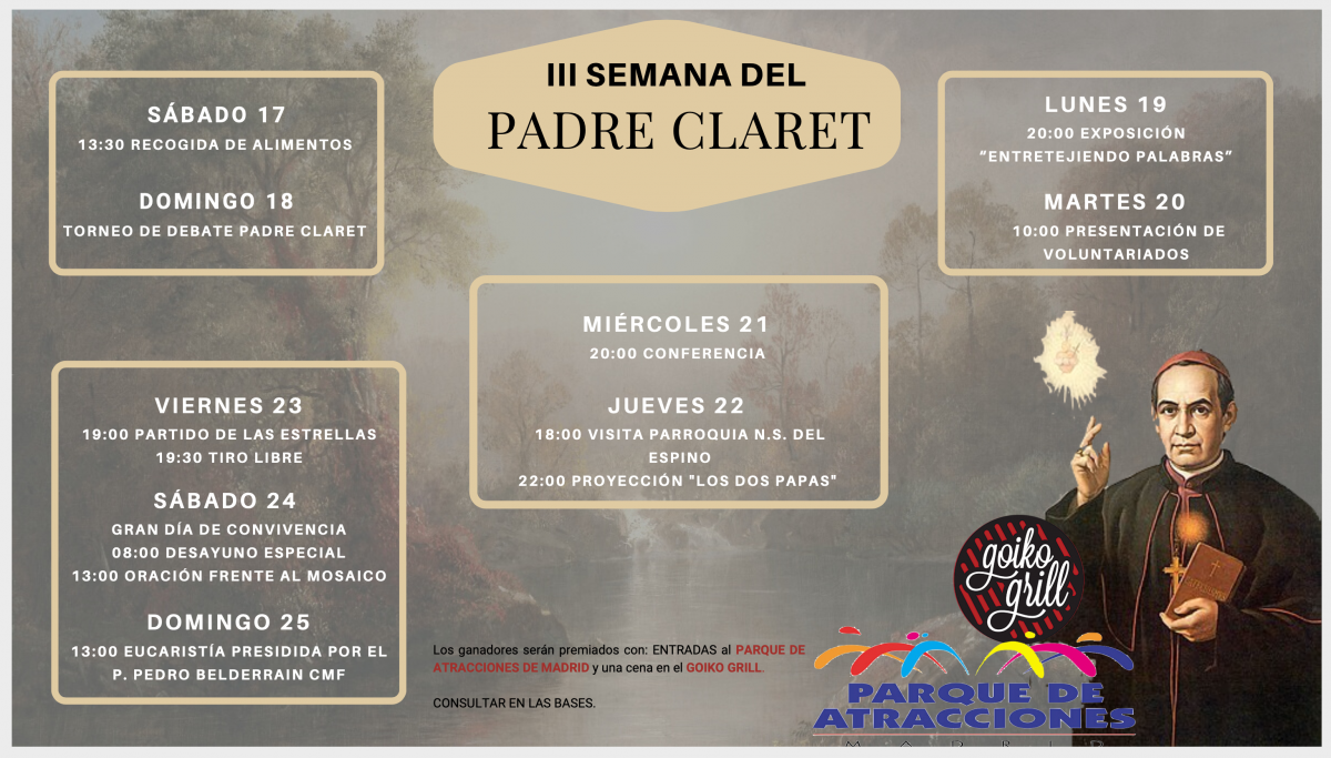 Un año más, y ya vamos por la tercera edición, la fiesta del Padre Claret se celebra de manera muy especial en el Jaime del Amo involucrando a todas las áreas de actividades de nuestro Mayor. Entre los días 17 y 25 de octubre pudimos disfrutar de un calendario de actividades muy amplio para acercarnos y conocer un poco mejor la vida del fundador de los Claretianos.