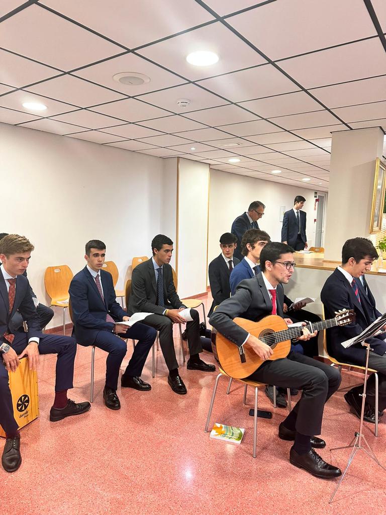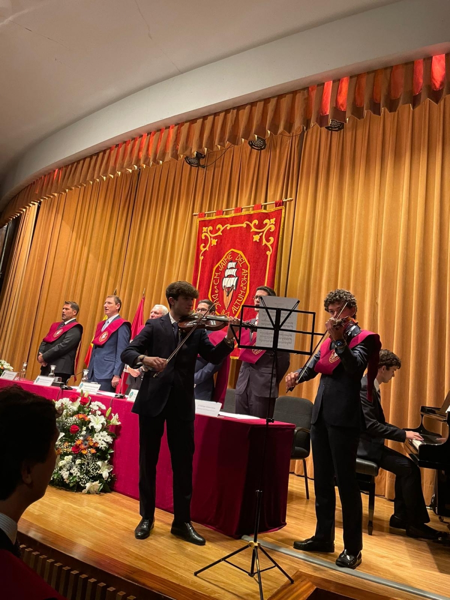 Para finalizar, como es tradición, se entonó el Gaudeamus Igitur, esta vez con la colaboración de los colegiales D. Guillermo Alonso-Jáudenes Paz y D. Adolfo Ferrín García-Montañés al violín; y el colegial D. Nicolás Santana Tristancho al piano.