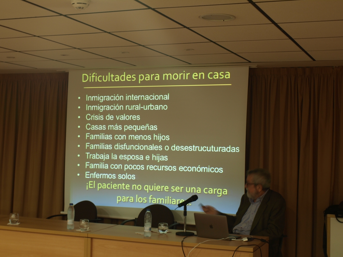 El Dr. Marcos Gómez realizó una fascinante presentación dotada de citas históricas y audios musicales donde nos reflejaba en profundidad la complejidad para poder morir en paz en el día de hoy, reivindicando un mayor protagonismo de los cuidados paliativos, en los cuales el respeto al paciente y el acompañamiento profesional y humano a los pacientes y sus familiares son clave para una muerte digna.