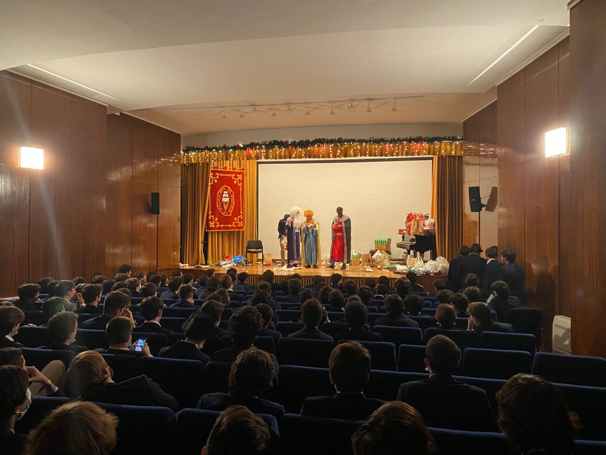 La noche finalizaría con un gran evento. Gracias a las gestiones del Área de Convivencia, contamos con la presencia de Sus Majestades los Reyes Magos de Oriente, que se unieron a nuestra celebración. Fue todo un honor para nosotros que nos acompañaran en este día, pues sabemos bien que se acercan fechas complicadas para ellos, y que sus agendas están muy ocupadas hasta el día 6 de enero. Solo tenemos que lamentar un pequeño contratiempo, y es que hubo tres colegiales que no pudieron verlos. Sentimos mucho que, por motivos personales, los colegiales D. Pedro Hernández-Penide Guio, D. Manuel Albacete Carazo y D. Daniel Ruiz Molina, no pudieran saludar personalmente a Sus Majestades.