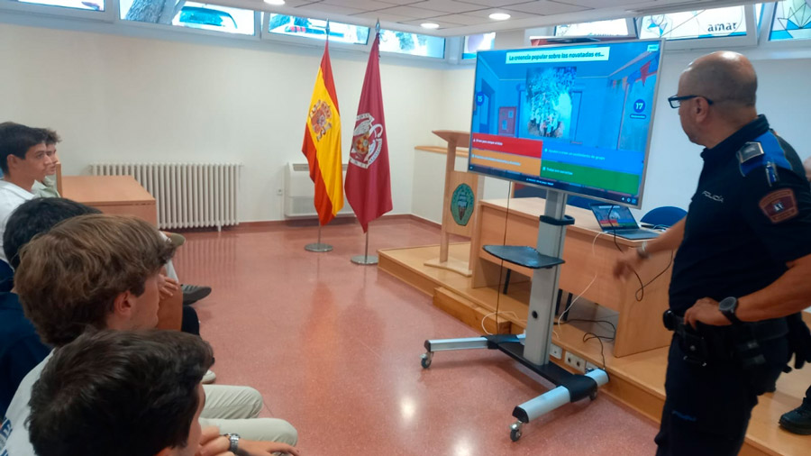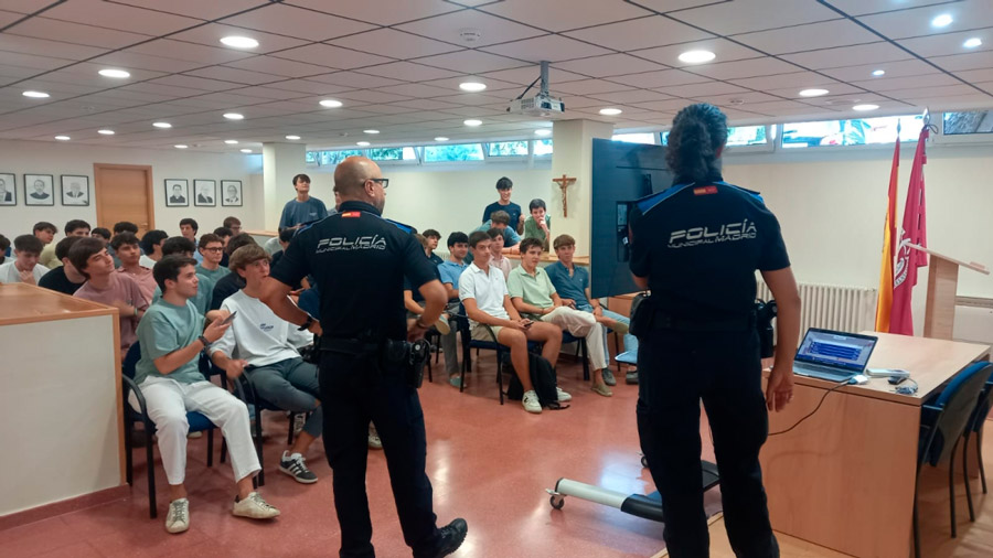 Ese mismo día, recibimos la visita de dos agentes de la Policía Municipal de Madrid, en el marco del citado convenio. Ofrecieron una charla muy cercana y clara a nuestros colegiales de primer año, y les explicaron las repercusiones que puede tener participar en ellas, tanto a nivel administrativo, como académico e incluso penal. Compartieron experiencias reales que evidenciaron lo dañinas que son estas prácticas.