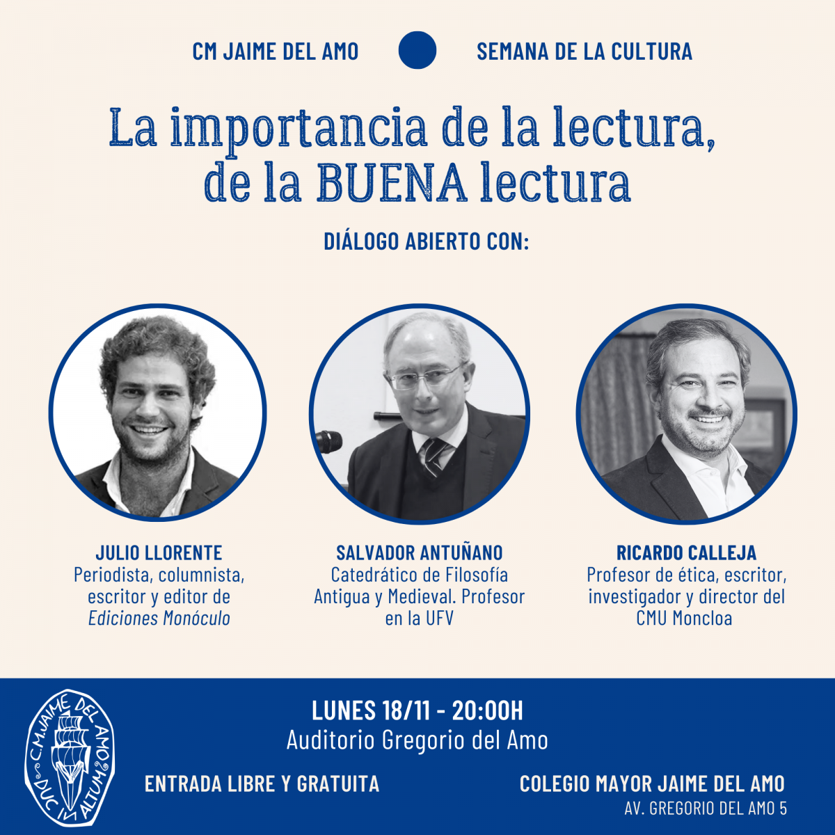 Posteriormente a esta inauguración, disfrutamos del coloquio sobre la importancia de la lectura con D. Ricardo Calleja, D. Julio Llorente y D. Salvador Antuñano. Unos invitados de altura con los que reflexionamos sobre la importancia de leer buenos libros, hacer un ejercicio de comprensión y asimilación de aquello que leemos o cómo elegir un buen libro.