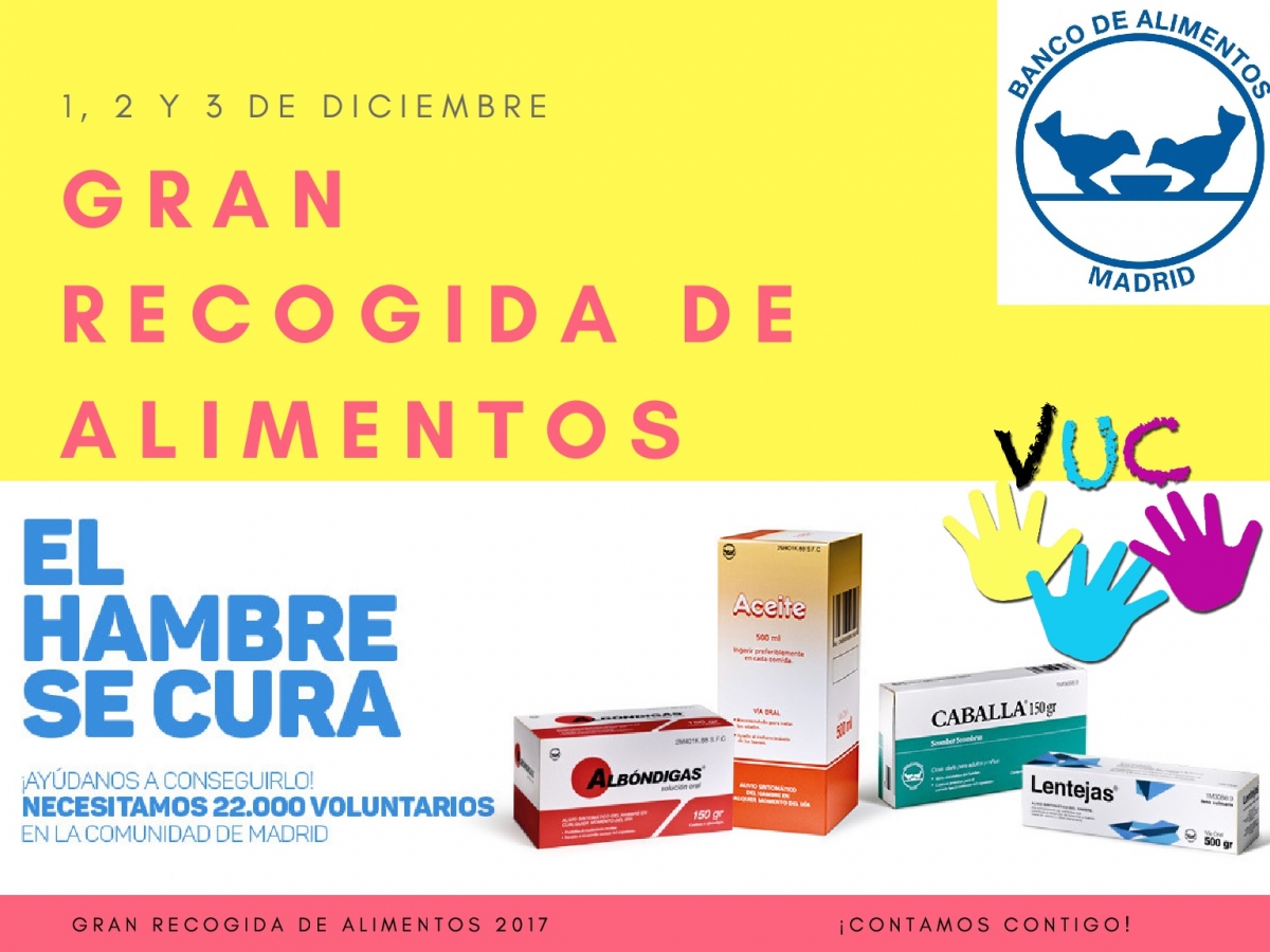 Organizado desde el VUC (Voluntariado Universitario Conjunto), y bajo el lema: «El Hambre se cura», se nos destinó a dos supermercados de la cadena DIA cercanos a nuestro Mayor para que fuésemos en horas estipuladas del sábado y del domingo a la recogida de alimentos.