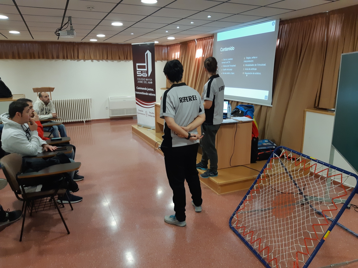 Seguramente, una de las grandes sorpresas y novedades dentro de las actividades en nuestro Colegio Mayor haya sido el desembarco del Tchoukball, deporte alternativo surgido en la década del 70 y declarado por la UNESCO como Deporte de la Paz, por su espíritu de Fair Play y por no tener ni contacto ni violencia en su desarrollo. Luego de la jornada de presentación realizada en septiembre, se dieron algunos entrenamientos de la mano de antiguos jugadores de la selección femenina y masculina de España, quienes en estos momentos integran el comité de la Asociación Española de este deporte (AETB). El siguiente paso fue la inscricpción de nuestro primer equipo en la Liga Nacional, conformado tanto por colegiales como por miembros del Equipo Directivo.