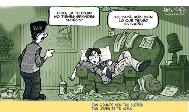 La cuestión está en soñar y aclarar las ideas propias. No se trata de hacer “lo que me da la gana” sino de plantearse unas metas y trabajar por ellas. Eso es lo que hace grande a la juventud. Más allá de si no se consiguen todas. Da pena que algunos jóvenes se queden como el joven de la viñeta: tumbado en el sofá y pensando sólo en dormir. No se da cuenta de que se está perdiendo lo mejor de la vida: su propia vida.