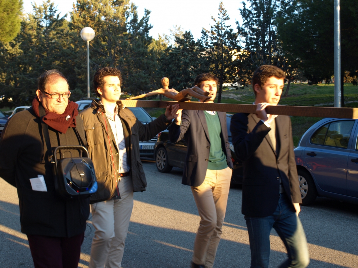 Mientras recorríamos los alrededores del Colegio portando al Crucificado, realizábamos las diferentes estaciones del Via Crucis a pesar de que las condiciones meteorológicas no acompañaban. Entre petición y petición, los colegiales nos turnábamos para cargar con la Cruz haciendo así de este acto, un acto de todos.