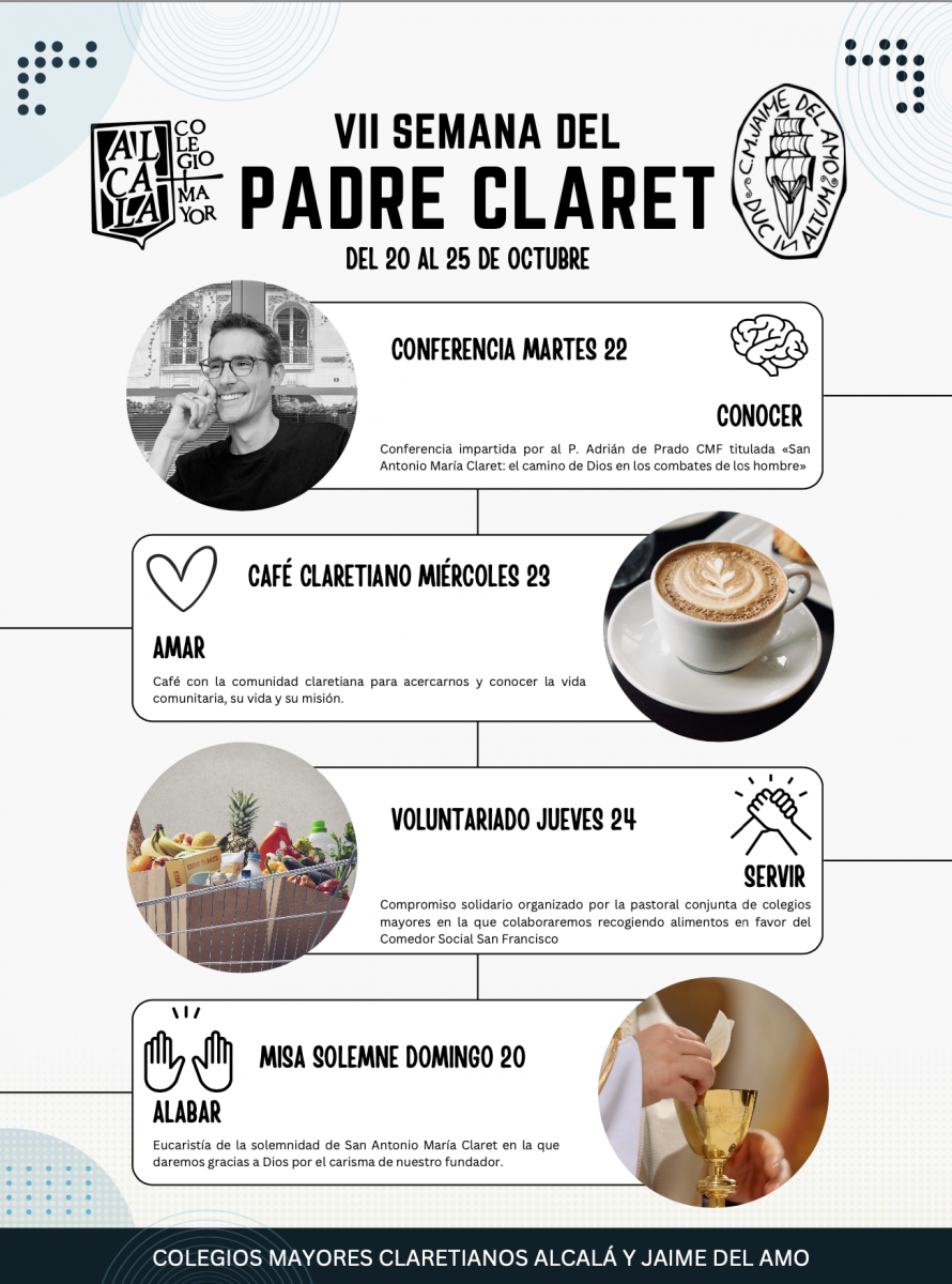 Entre el 20 y el 24 de octubre, los Colegios Mayores Claretianos Alcalá y Jaime del Amo celebraron la séptima semana del Padre Claret, una iniciativa conjunta para acercar a ambas comunidades educativas la figura de San Antonio María Claret, fundador de los Misioneros Claretianos y patrón de ambos Mayores.
